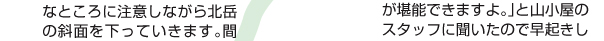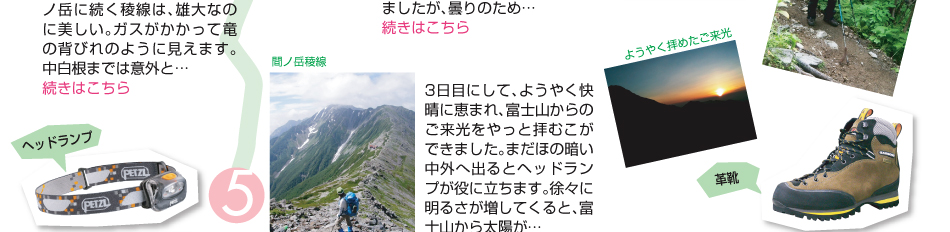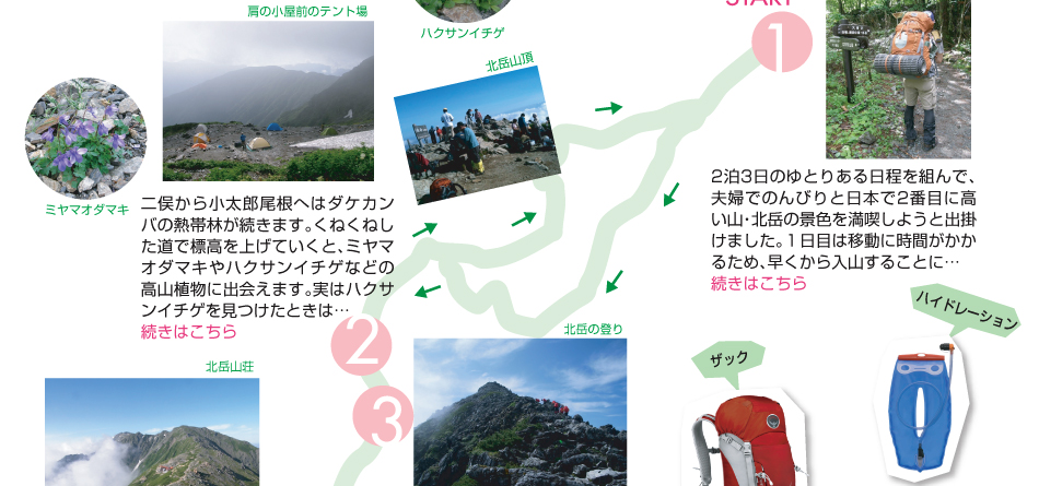 急な岩稜の下りがあり、危険なところに注意しながら北岳の斜面を下っていきます。間ノ岳に続く稜線は、雄大なのに美しい。ガスがかかって竜の背びれのように見えます。中白根までは意外と近い気がしましたが、間ノ岳までは小さなピークを何度か繰り返し、疲れがみえてきました。今日の宿泊地・北岳山荘をめざしてもうひと踏ん張り!小屋でいただいた水をハイドレーションパックに入れザックのバックパネル内側にあるハイドレーション専用のポケットに装着してきたので、小まめに水分補給することができました。