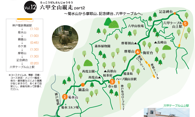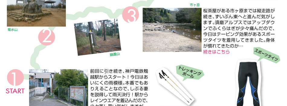 桜茶屋がある市ヶ原までは縦走路が続き、ずいぶん東へと進んだ気がします。前回の須磨アルプスではアップダウンでふくらはぎが少々痛んだので、今日はテーピング効果があるスポーツタイツを着用してきました。身体が慣れてきたのか、効果が出たのか、足の方は快調に動いています。