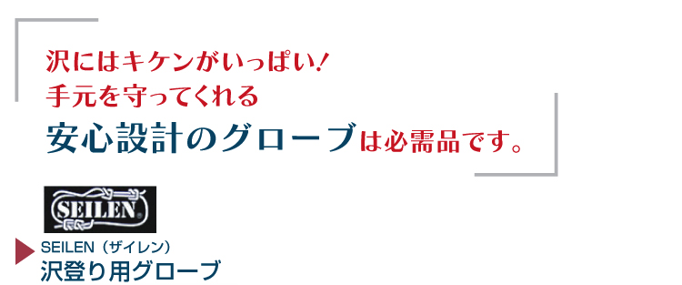 沢登りで大活躍のグローブは、グリップカット(特殊断裁加工)を採用。滑りにくく、ケガ防止や冷え防止に。