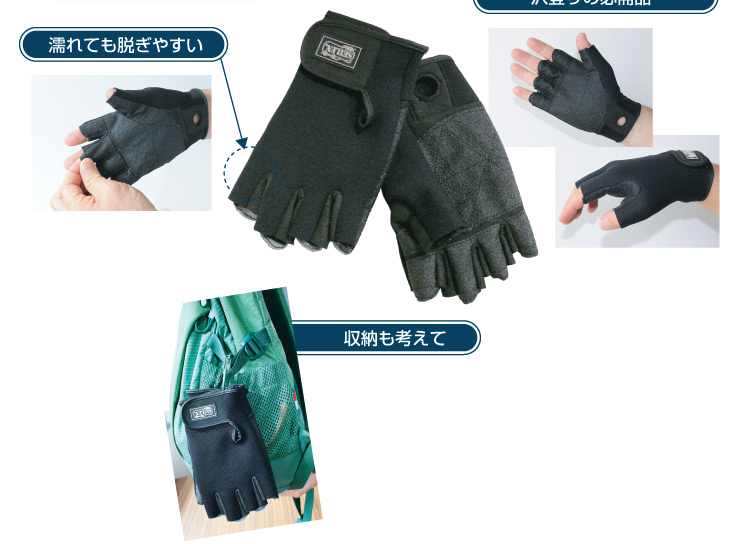 水に濡れると脱ぎにくくなるグローブですが、指の先を引っ張ると簡単に脱げる指切りタイプです。