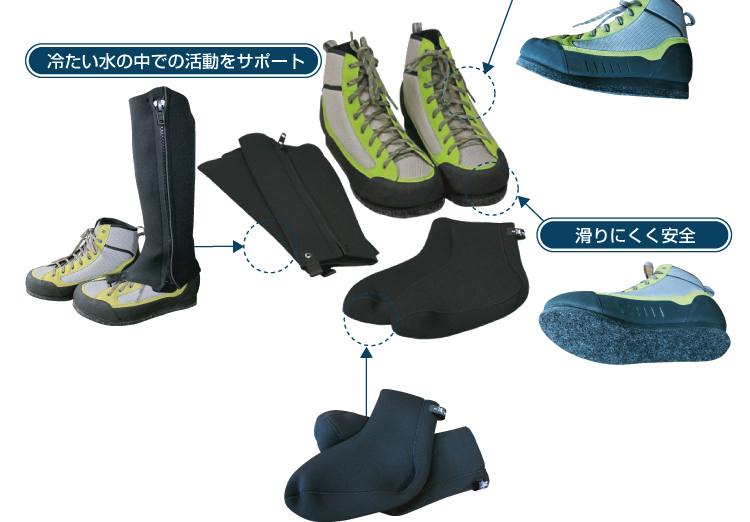 厚さ3mmの発泡ラバー素材のソックスとスパッツは、保温・保護に優れ、冷たい水中での活動をサポートしてくれます。スパッツはシューズの上からフィットさせて使用すると、水の浸入を防げます。