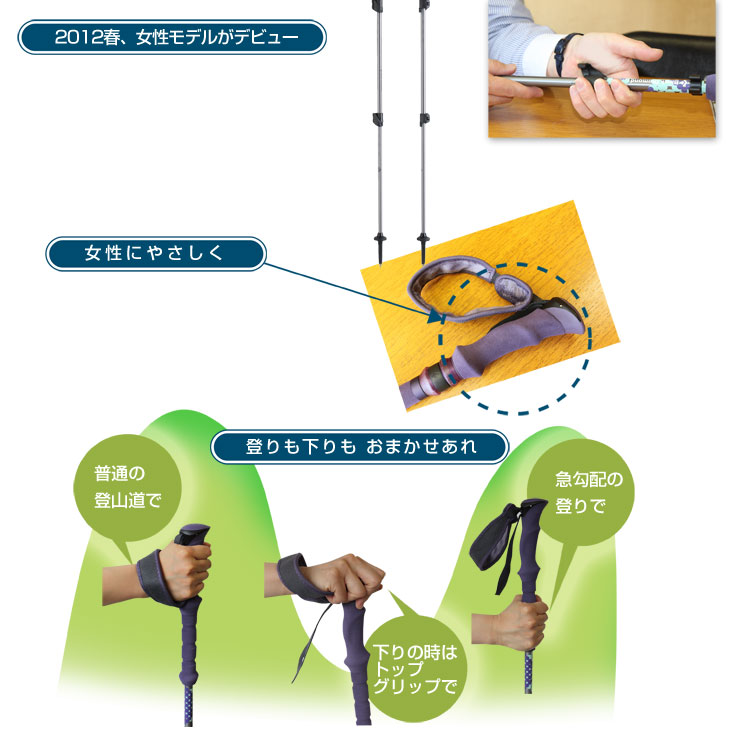 女性が握り易いようグリップが細く、短い設計。ストラップは内側に起毛が施され、長時間の山行で手首の擦れを軽減します。