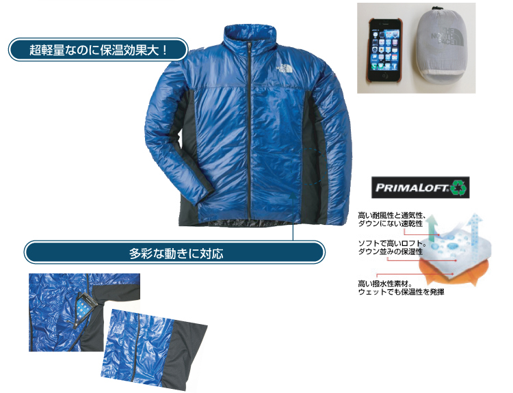 極薄シェル素材のなかに薄いシート状の化繊綿・プリマロフトを封入。リサイクルファイバーで、保温力とコンパクト性を実現しました。