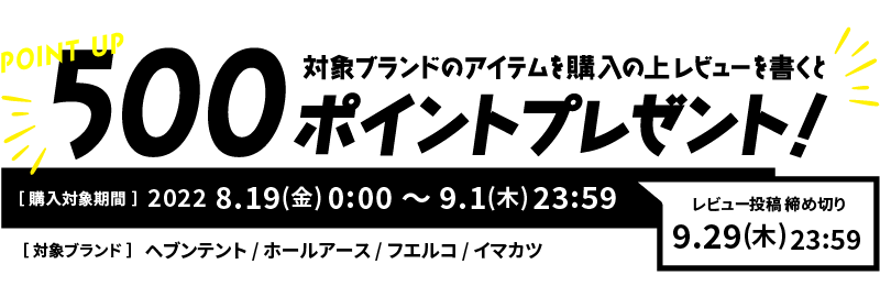 キャンペーン期間中に対象ブランドアイテムをご購入の上、レビュー投稿で500ポイントプレゼントいたします。