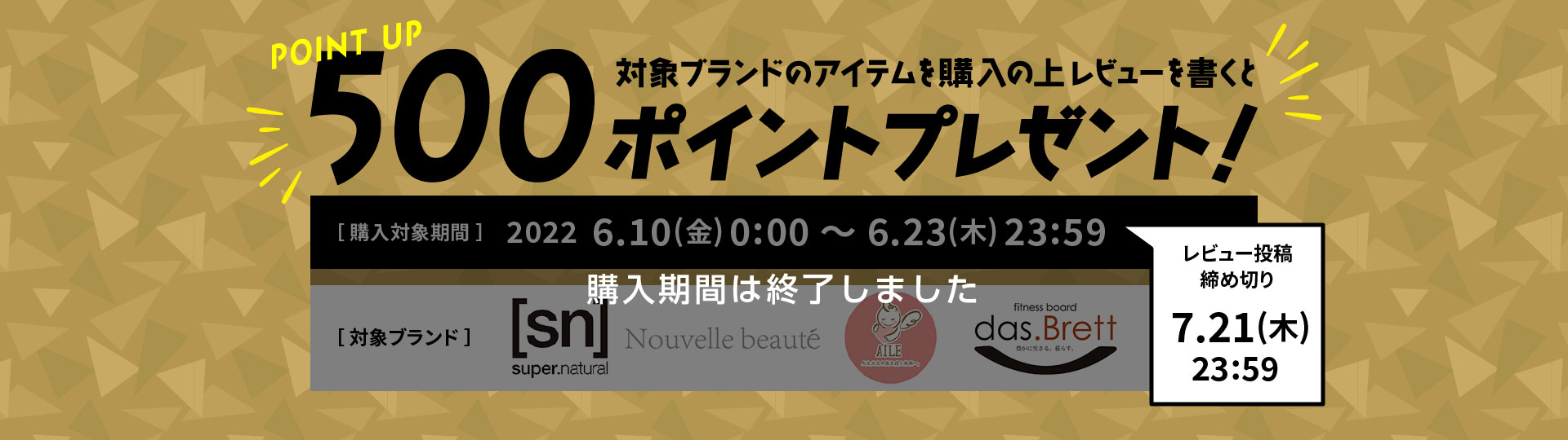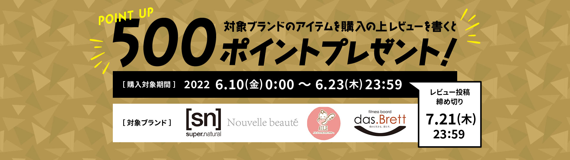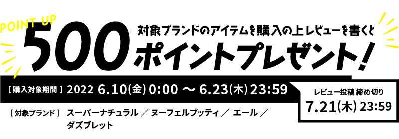 キャンペーン期間中に対象ブランドアイテムをご購入の上、レビュー投稿で500ポイントプレゼントいたします。