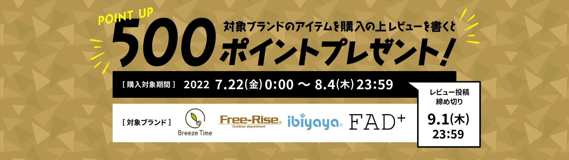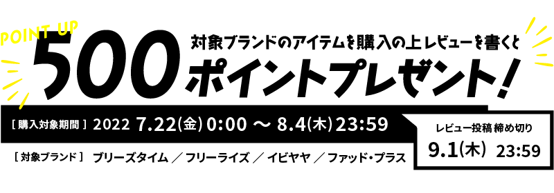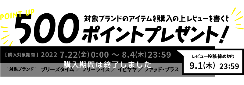 キャンペーン期間中に対象ブランドアイテムをご購入の上、レビュー投稿で500ポイントプレゼントいたします。