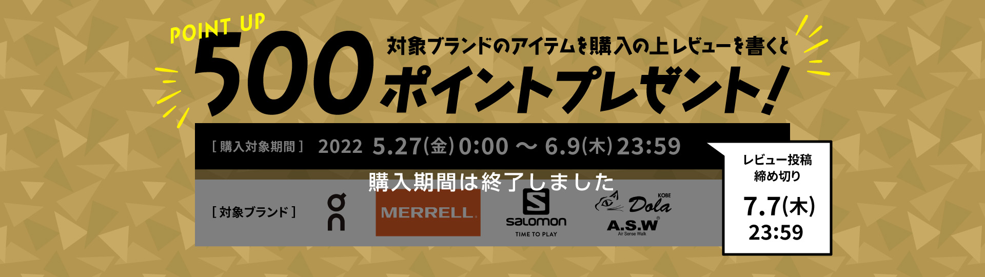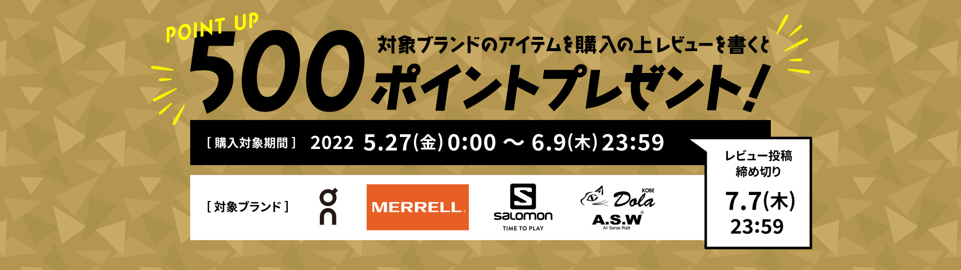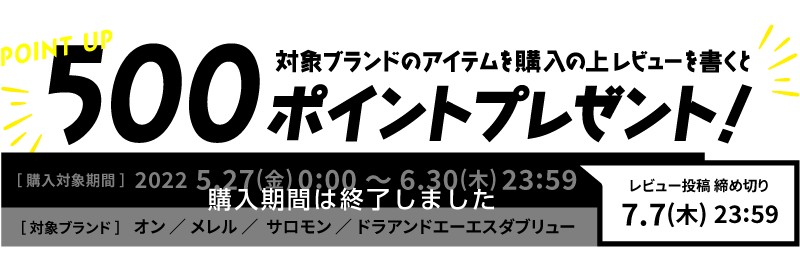 キャンペーン期間中に対象ブランドアイテムをご購入の上、レビュー投稿で500ポイントプレゼントいたします。