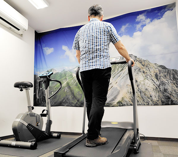 室内での体調管理のためにパルスオキシメーターという血中の酸素状況を測る機器を人差し指につけます。カンタンな問診のあと入室、本を読んだりしながら30分安静にします。そのあとウォーキングマシンやクライミングマシンを使って30分程度(15分を2セット)軽い運動をします。運動中は、心拍数が高くなり過ぎないように注意します。ただし運動強度が弱すぎても大きな効果は期待できません。運動中に気分が悪くなったり、非常にきつくなったりした場合は、運動を中止します。