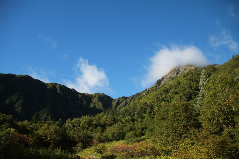 見上げると 青空に映える北岳。肩の小屋に泊まっていれば 、展望が・・・。