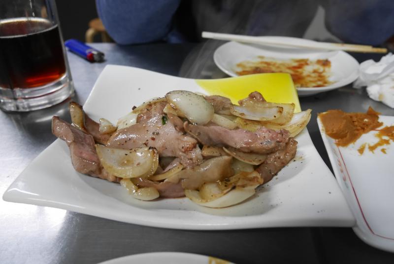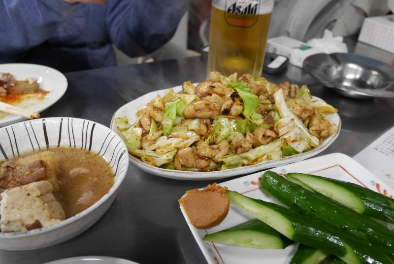 メニューはほぼ肉。なんとなく目についたホルモン炒めと煮込みときゅうり、生ビールを頼む。煮込みはモツや豆腐以外に大ぶりの大根なども入っていて野菜が多くてうれしい。ホルモン炒めは餃子皿くらいの器にこれでもかというくらいもりっと盛られて登場。これで550円か。ひとくち食べると味しょっぱめでめちゃくちゃビールが進む。さすが名物だけあって納得の一品。