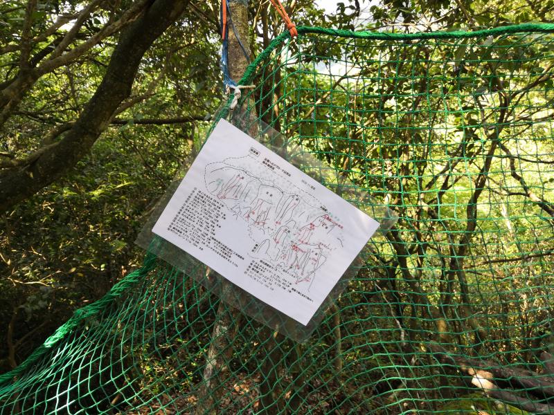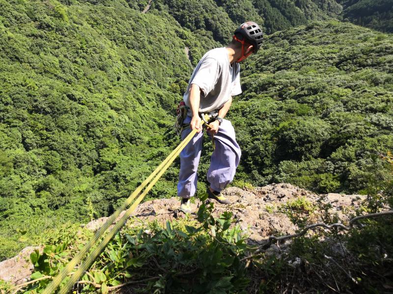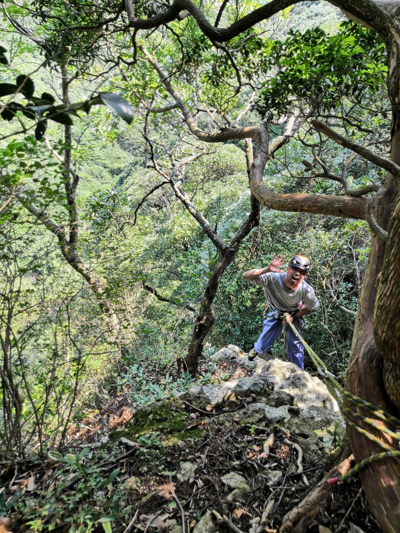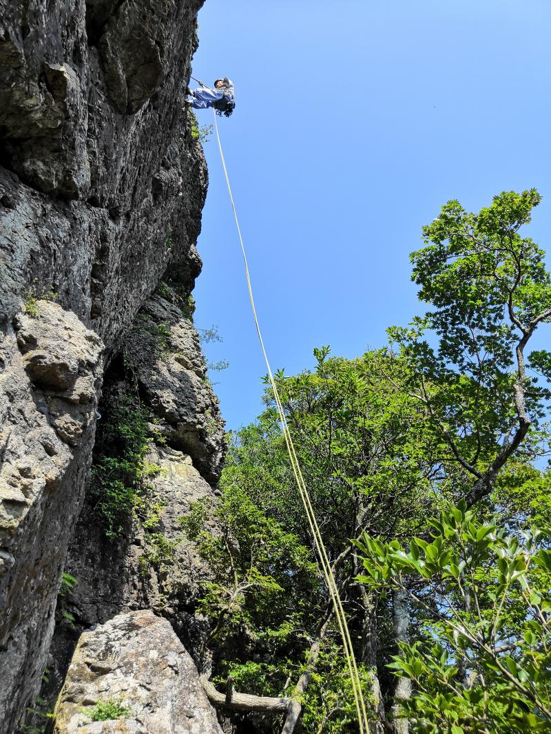 懸垂支点やボルトも新しく、アプローチ用にステップが打ってあったり地図があったりフェンス的な網を設置していたり。ブッシュ帯も含め懸垂支点から正しく降りるとほぼ取り付きにつけるようになっています。整備の情熱と丁寧さに脱帽です。毎度毎度、山口県の山は地元の人に大切にされ愛されているという印象を受けます。