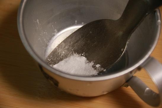 ▪テフロン加工の鍋をアルコールバーナーにかけて、アルコールを飛ばした白ワインを入れて温める