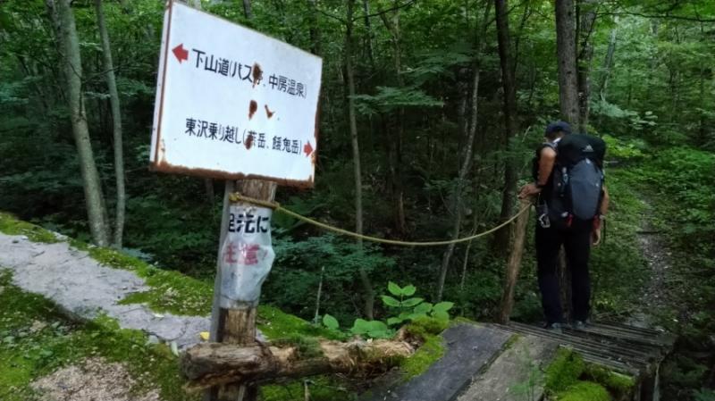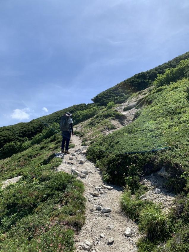 東沢乗越以降もしばらくは笹やぶが続き、登山道も両脇の樹木がせり出していて歩きづらいです。