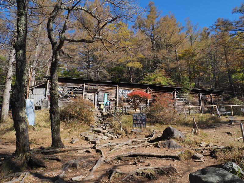 瑞牆山荘の登山者駐車場は平日なのになかなかの混雑ぶり。瑞牆山荘からの登山道も紅葉が色鮮やかです♪少し登ると美しい紅葉の中から瑞牆山がドカーンと相変わらず迫力があります。この辺りの紅葉(黄葉)がほんとに鮮やかで綺麗でした♪水場で水を補給して、冨士見平小屋に到着。