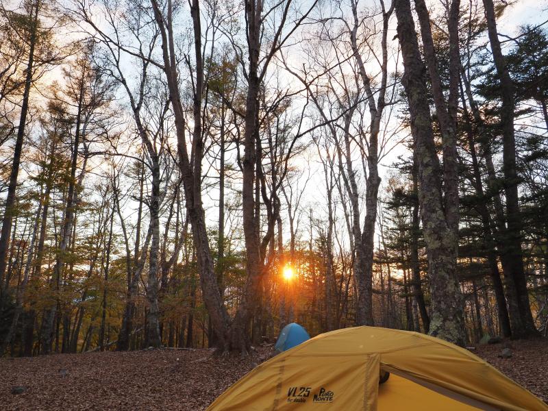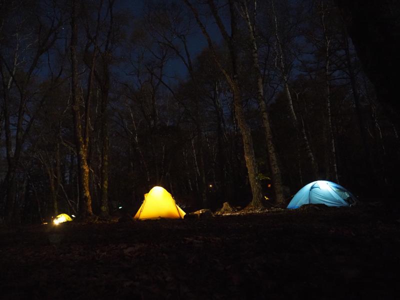 テント装備を背負って歩く時間が短く、樹林帯のテント場で風の影響も受けにくいのでテント泊デビューにもおすすめですね。この日程の前の土日はなかなかごった返したようですが(笑)