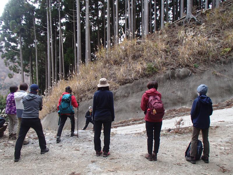 民家の間を通り、登山道入り口を通り過ぎて・・・あれ、?いま、通り過ぎたような・・・と思った方もいたと思います。しばらくして、田中ガイドが立ち止まり、読図の実技講座が始まりました。