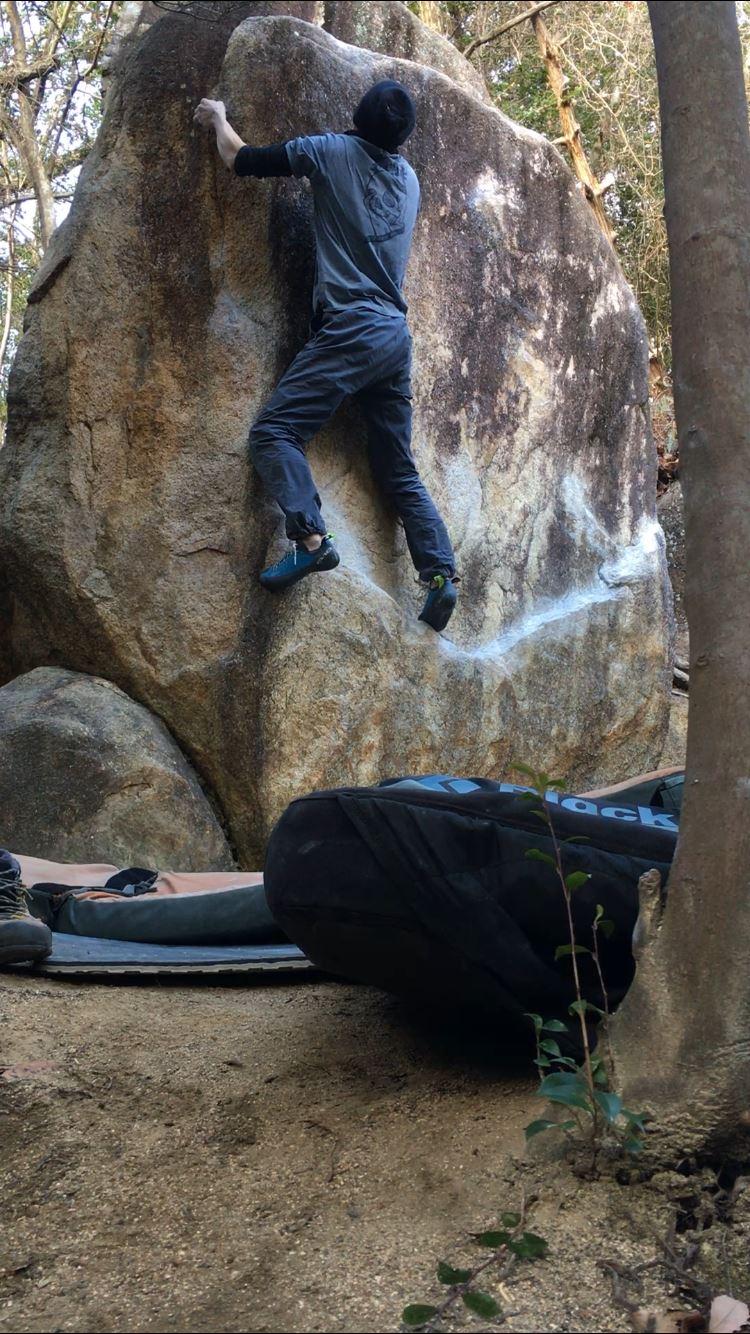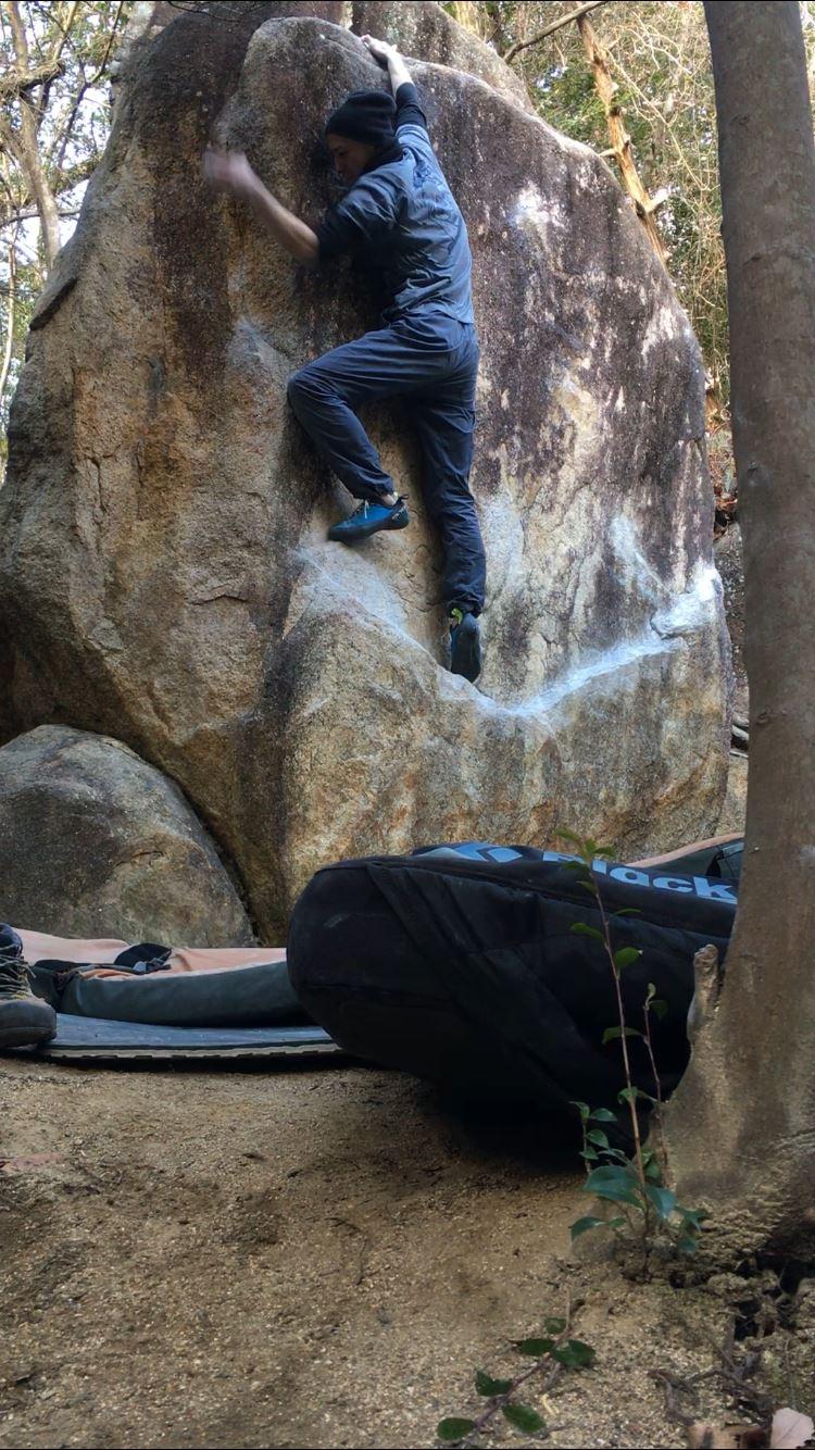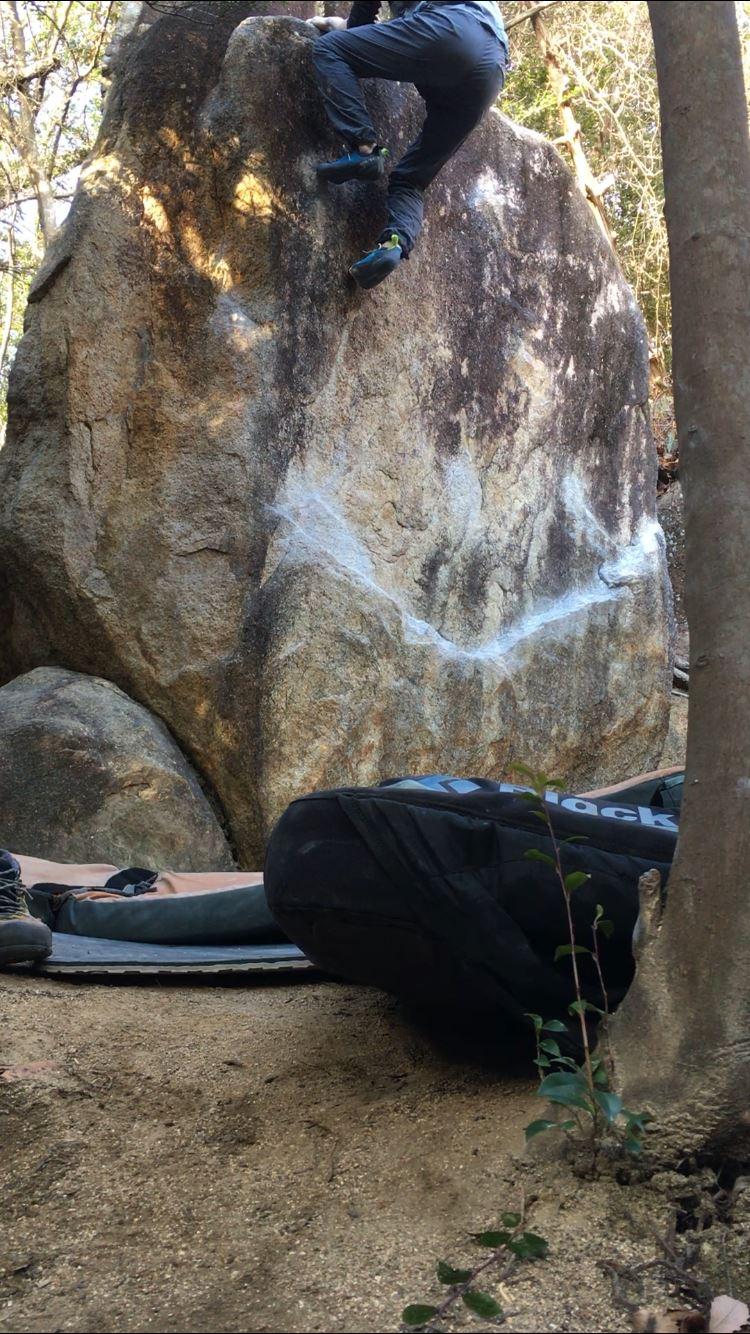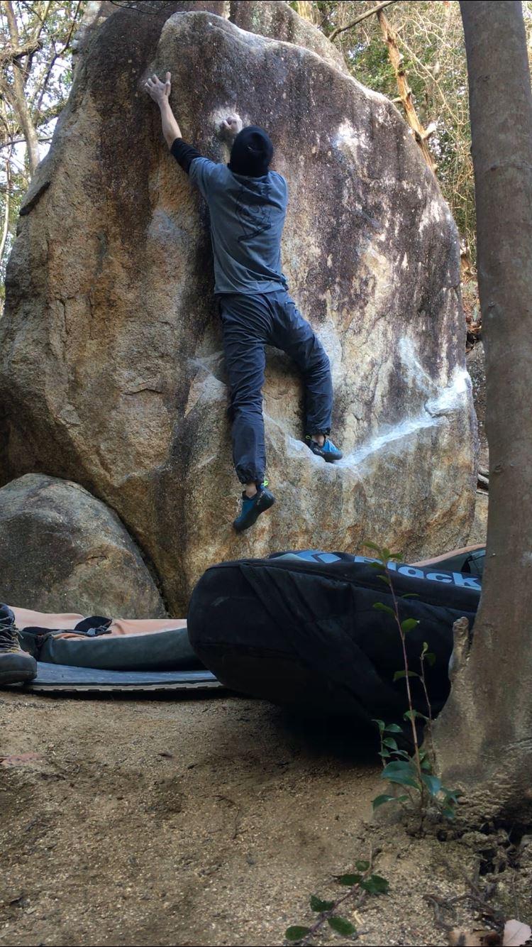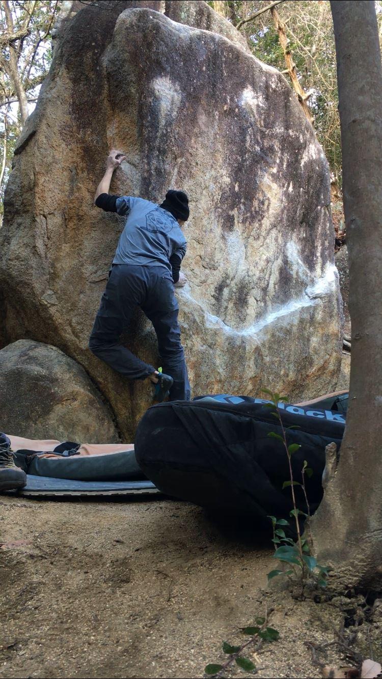①「淡雪」の岩を探してさまよっていた時に見つけた課題。リップのホールドがもろく、その内壊れそう。