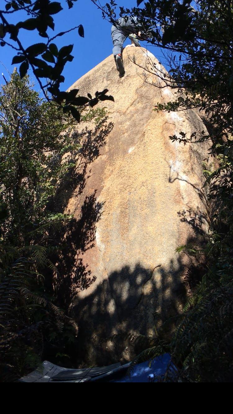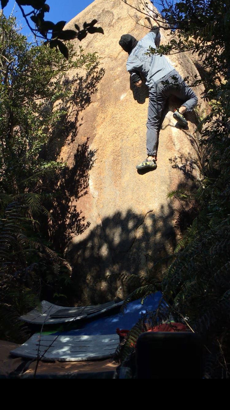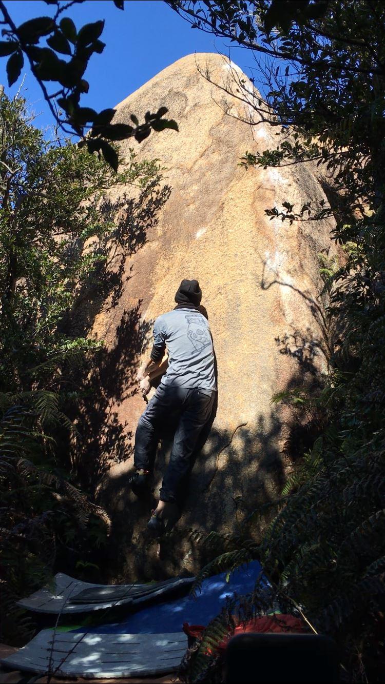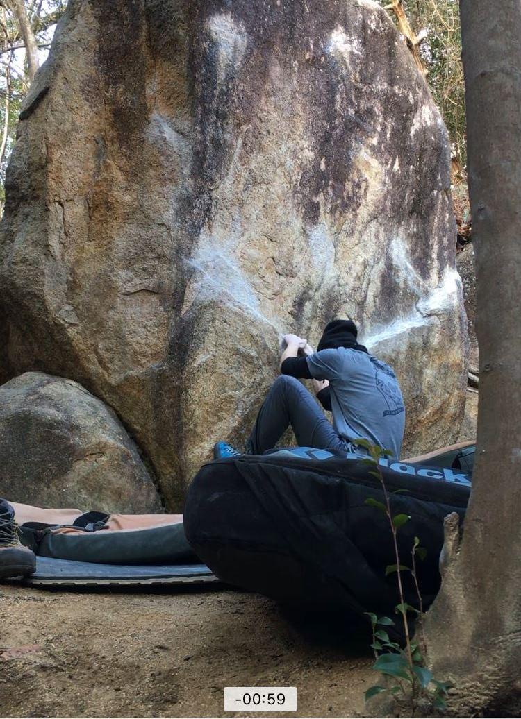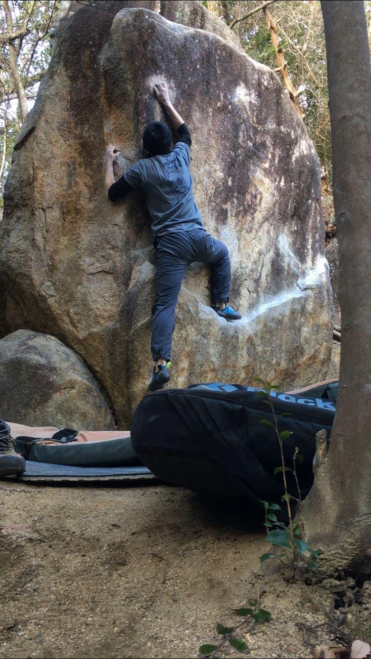 ①「淡雪」の岩を探してさまよっていた時に見つけた課題。リップのホールドがもろく、その内壊れそう。
