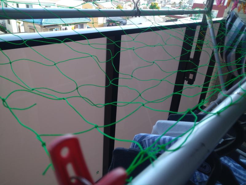 布団干しにカラス避けネットを張ってその上に乗せて日陰干し。