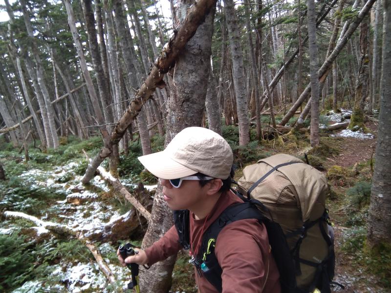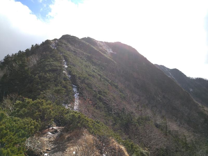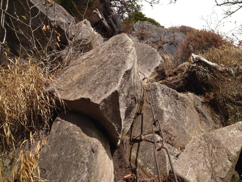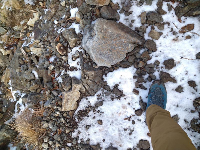 そして崩落地横の急登。雪と地面の凍結で滑りやすく、岩は冷え切って手がかじかみそうです。ここからしばらく右に切れているので足元に気を付けながら歩き、三角点下の岩場まで来ました。日当たらないので先ほどと同じような状態。下りで通るときは特に注意が必要でしょう。ここを登りきるとハイマツ帯となります。雪と霜が解けたのか濡れていました。午後なのでそれほどではなかったですが朝一の場合はよく濡れそうです。