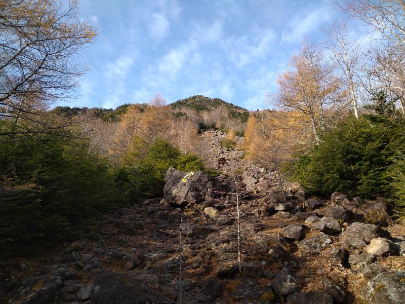 富士見峠からわずかで小真名子山のガレ場となります。火山性の土壌なので地面は緩く崩れやすいので後続がいるときは特に落石に注意する必要があります。電波反射板を過ぎるとすぐに山頂です。小真名子山から深い森の中の鷹ノ巣と言うコルに降り、再び登り返えすと大真名子山の山頂です。山頂の少し手前に崩落で登山道が切れている場所がありましたので巻くときにはご注意を。