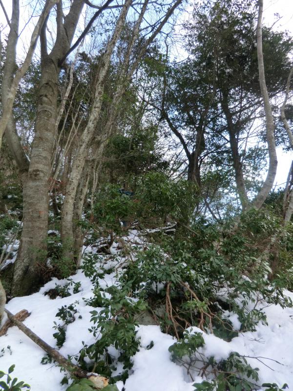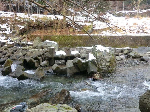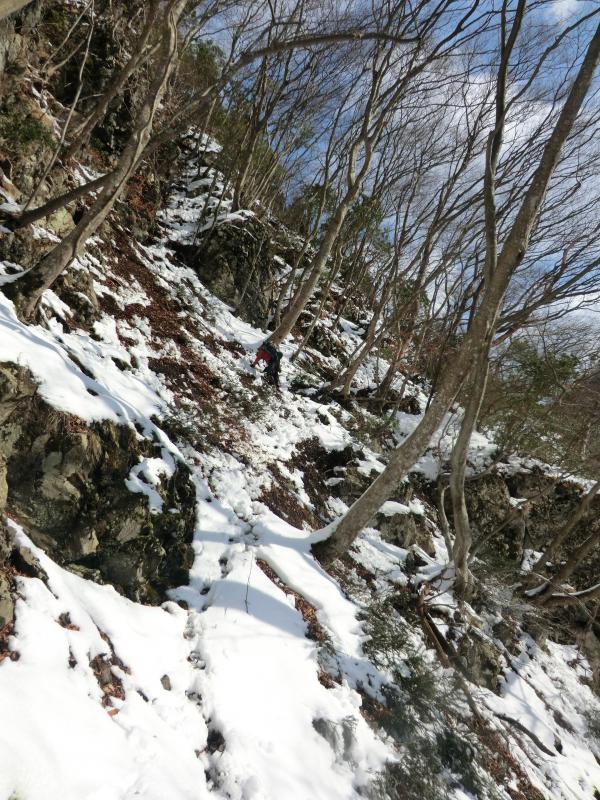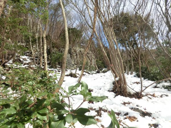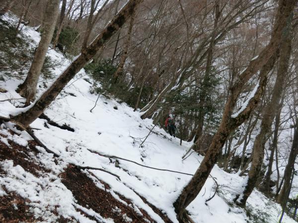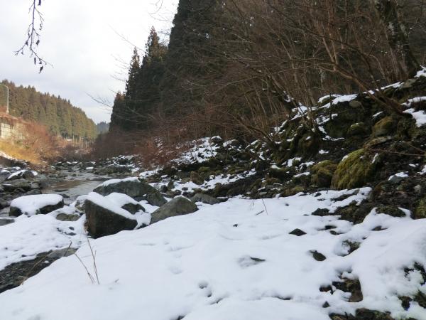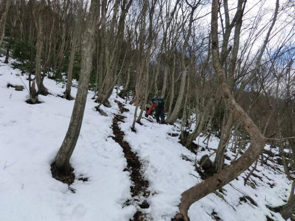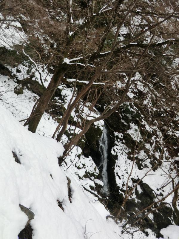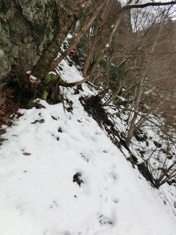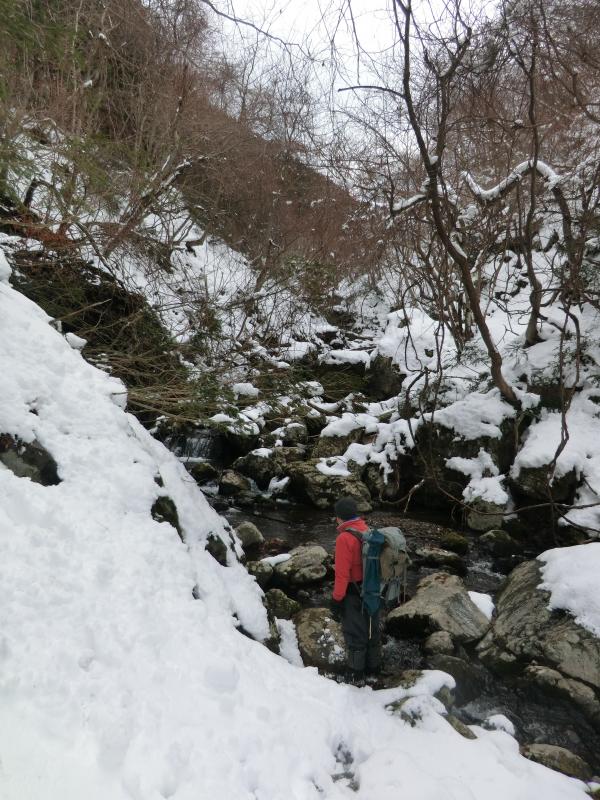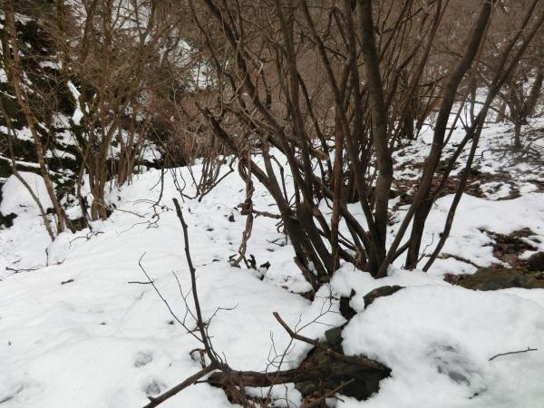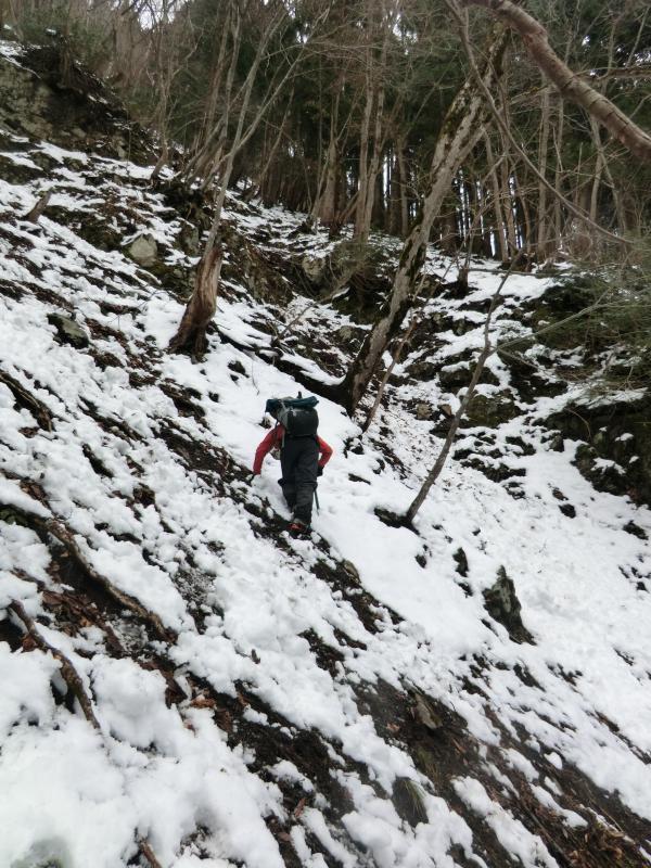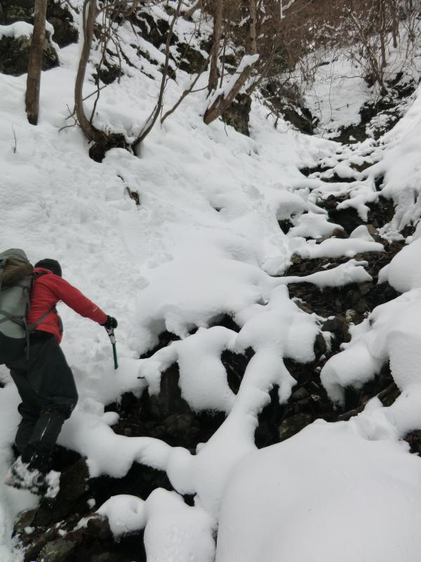 - バス停から沢に入るために渡る川が 足元が悪く渡りにくいです 下流の沢沿いの岩は滑りやすく 山の斜面を歩いても積雪がたいしてないので 雪のすぐ下は土と岩が出てきて足元は非常に悪いです 稜線近くなると沢の中の方が歩きやすい所もあります 山頂付近は雪にはまると膝くらいまで沈みます