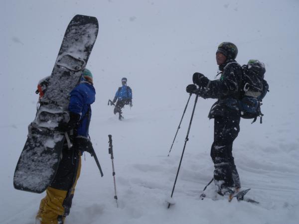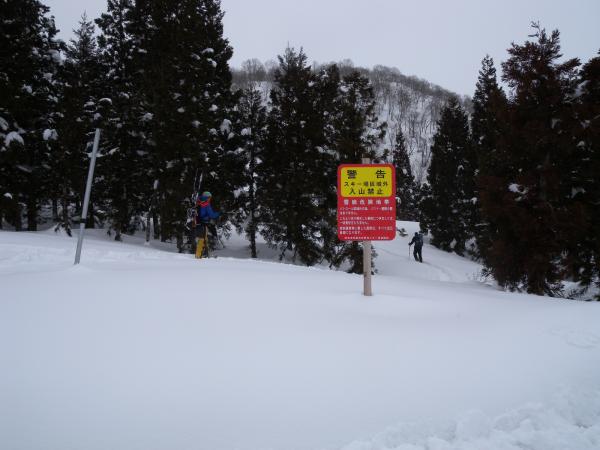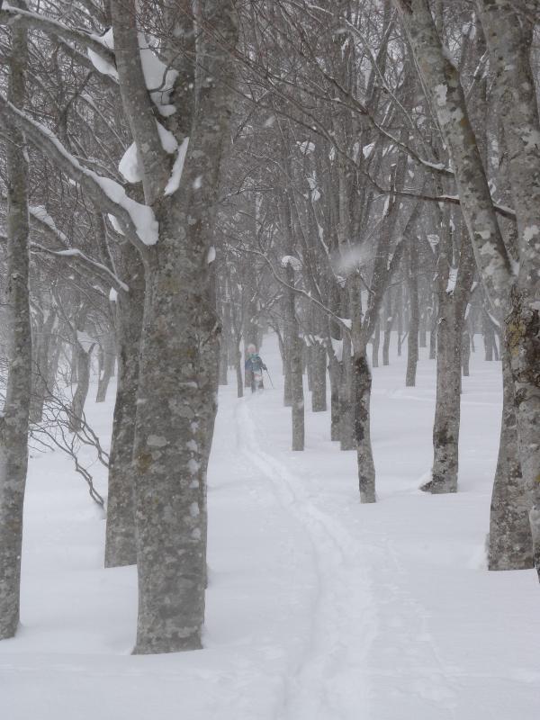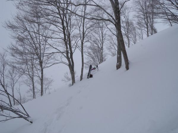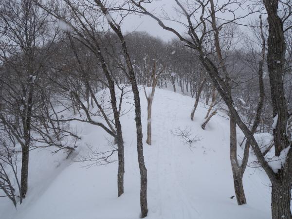 休暇村妙高脇スキー場より、エントリー。沢を渡り取り付きは、尾根沿いに、勾配は割と急で、スキーは、トラバースを繰り返す。一時間後なだらかなツリーの中を歩く、雪質はとても軽く40cmオーバーのパウダーでした。