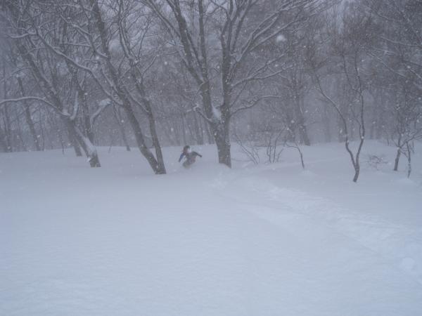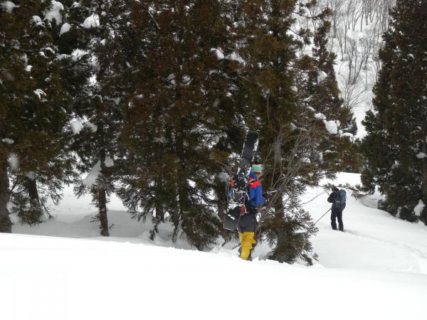 ツリーランは間隔も広く滑りやすい。下部はスキーだとトラバースして奥に降りて楽しめ、ボードは尾根沿いを細かくターンを切替して降りる感じでした。