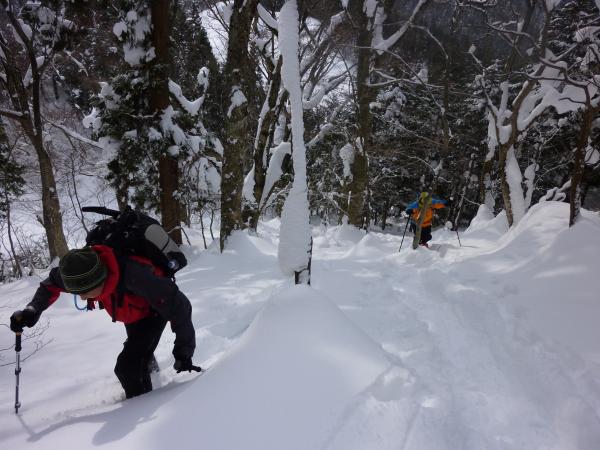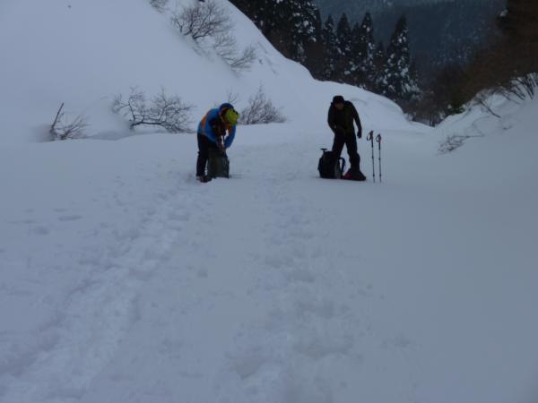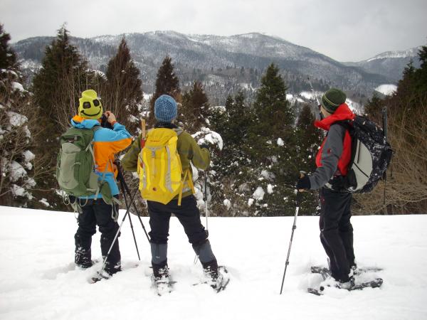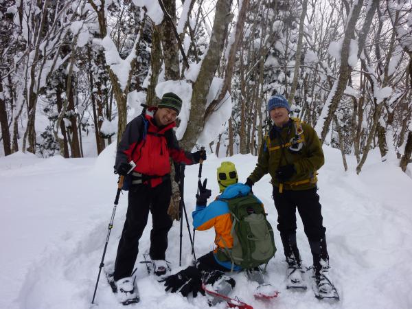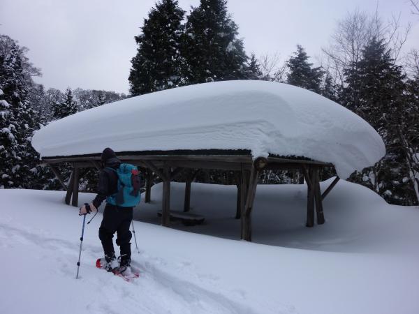 - スキー場積雪180cm(1月23日現在)。 スキー場駐車場から県道を徒歩5分のキャンプ場横で除雪は終了、ここからスノーシューを装着。柔らかくたっぷの雪でした。トレースがあったのですが、当日は他のパーティーには会わずでわれわれで貸切状態でした。あずまやからはコンパス・地形図と読図力が必要です。