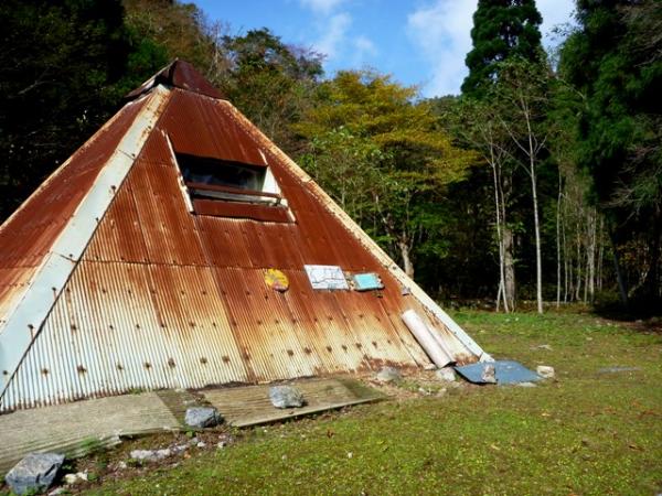 雪が深すぎて捨てられた村です。集落あとにはなんとも不気味な三角錐の小屋があり、