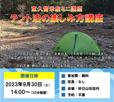 9/30開催から始まるミニ講座のご案内です! 『テント泊の楽しみ方講座』 登...