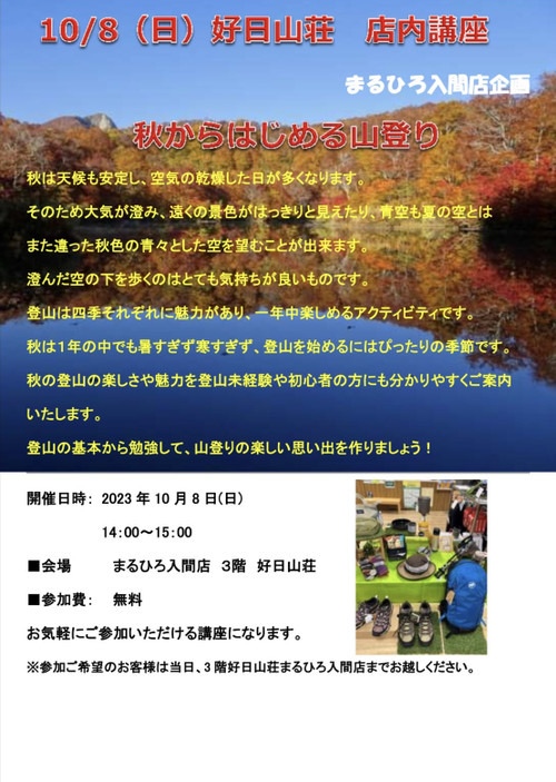 こんにちは!好日山荘まるひろ入間店です!! 10月店内無料講座のご案内です♪ 皆...