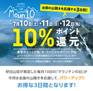 マウンテン【Moun10】の日が今月はスペシャルで『全国の山開きを応援する三日間!』となっております。期間が月に一日から三日間に増えて、遂に本日が最終日です!