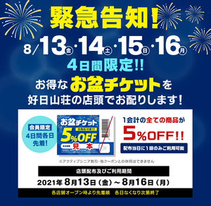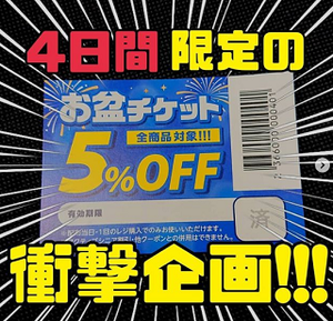 【緊急告知】4日間限定!1会計の全ての商品が5%OFFになる「お盆チケット」をご用意♬