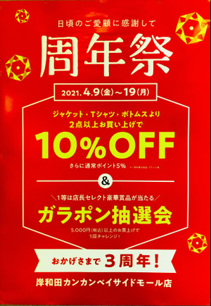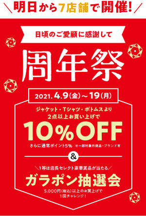 周年祭は本日ラストデー! ジャケット・Tシャツ・ボトムスのSET購入10%とガラポン抽選会やってま~す!