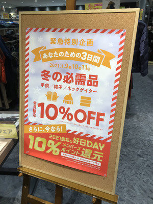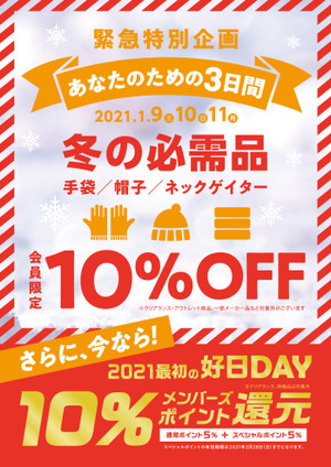 3連休限定の特別企画を実施します! 『冬の必需品10%OFF』 期間中、 手袋、...