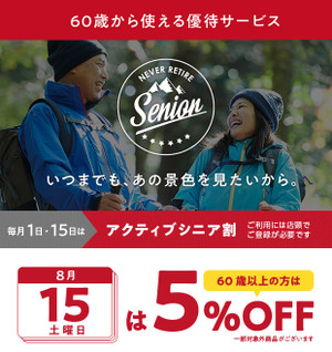 毎月15日と1日はアクティブシニアの日です。 60歳以上のお客様は5%OFFでお...