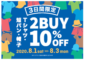 「2BUY10%OFF!」Tシャツ・短パン・帽子がお買い得!8月3日まで!