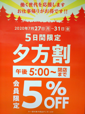 7月31日まで夕方割開催中です。 メンバーズカードお持ちのお客様限定で、店内商品...