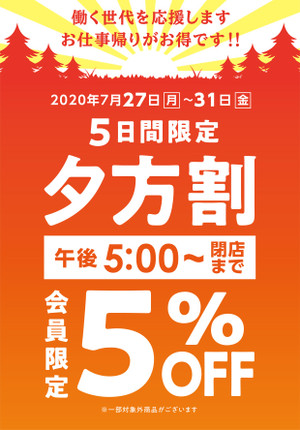 メンバー様限定 お得な夕方割を5日間行います!! 期間:7月27日(月)~7月3...