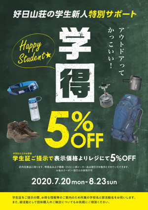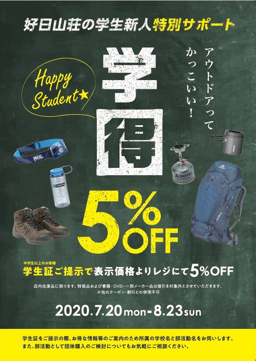 こんにちは。 好日山荘静岡パルコ店です。 本日7/20(月)より学割開始いたしま...
