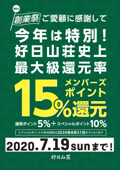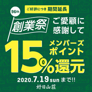 好日山荘創業祭!!メンバーズポイント15%還元!!