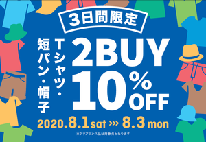 8/1~3の3日間限定のスペシャルオファー★Tシャツ、短パン、帽子を合せ買いで10%オフキャンペーン!!