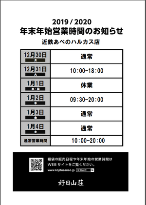 あべのハルカス店 年末年始営業時間変更のお知らせ