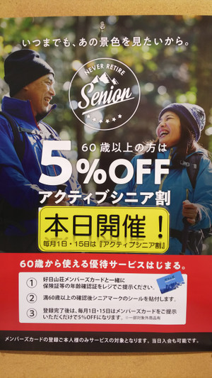 明日は満60歳以上のお客様5%OFF!アクティブシニアの日!