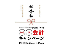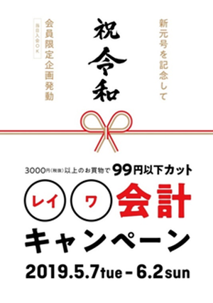 「祝★令和会計キャンペーン」3,000円(税抜)以上のお買い物で99円以下が割引きに!