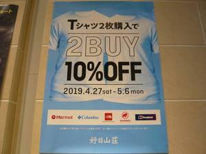 Tシャツ2枚で10%OFF!GWは好日山荘へ!