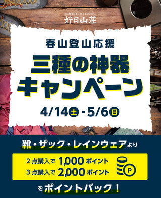 只今、春山応援三種の神器キャンペーンを実施中! 「登山靴」「ザック」「レインウエ...
