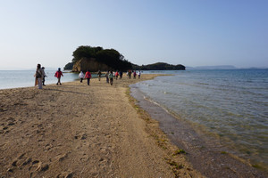 うどん県、ベースキャンプ高松店です。 毎月一回、小豆島の遍路道を歩いています。 今月の歩行レポートです。 第11回目の来島で、いよいよ最終行程へ。 播磨灘を望む、島の東エリアを約14㌔歩きました。 まずは話題のスポットの「エンジェルロード」へ。 別名「天使の散歩道」。 いつもは海に浮かぶ島ですが、潮の満ち引きで、 干潮時には対岸の島につながる一本の道が現れるのです。 この日は午前と午後の2回のチャンスが有り、 フェリーを下船後、直ぐに訪れました。 8:29の写真です(↑)。 余裕で対岸の島へ向かったのですが... なんと、8:31には道の両側から潮が満ちて来て、ビックリ! 急いで「戻ってきてェ~」のコールを発出 () 中にはジャンプする人も... ギリギリ、セーフ でした。 ちなみに8:37では、もう道の一部は冠水していました。 アッという間の出来事に一同、唖然。 本当に驚くべき自然現象を体感したのでしたぁ それにしても天気が良く、海も抜群に綺麗でした。 今日は「クライミングのメッカ」の吉田エリアからのスタート。 岩峰群に数名のクライマーが取り付いていました。 吉田から山越えで福田エリアへ、山岳遍路道を辿ります。 新芽が芽吹く中を気持ち良く歩きました。 小豆島では常に山と海を行ったり、来たりの繰り返しでしたが、 山道はとにかく人気で、面白かったですね。 福田に下山後、街中の札所巡りへ。 ここ福田は姫路との航路が有り、京阪神から訪れる人も多い。 街中には「遍路道」の所在を表す「遍路導(へんろしるべ)」も残され、 「導かれている」という意識も強く感じられます。 さぬき百景「福田海岸」が望める高台で、海を眺めてのランチ 。 ポカポカ陽気と少し肌寒い潮風とのせめぎあいは、春ならでは! 島の東海岸のシーサイドウオーク を愉しむ。 少し春霞が掛かり、遠望はクッキリと見えませんでした。 途上、遍路道とは離れ、かつて大阪城築城時に石垣として 切り出された場所を散策しました 。 今は「天狗岩丁場跡」として整備された、近年人気のスポットです。 巨石の間を登ったり、たまに潜ったり… 想定重量1700トンとも云われる「大天狗岩」で記念撮影。 圧巻の大迫力でした。 (◎_◎;) そして島遍路最後と
