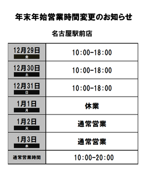 年末年始営業時間について 12月30日(土) 通常営業 10:00~21:00 ...
